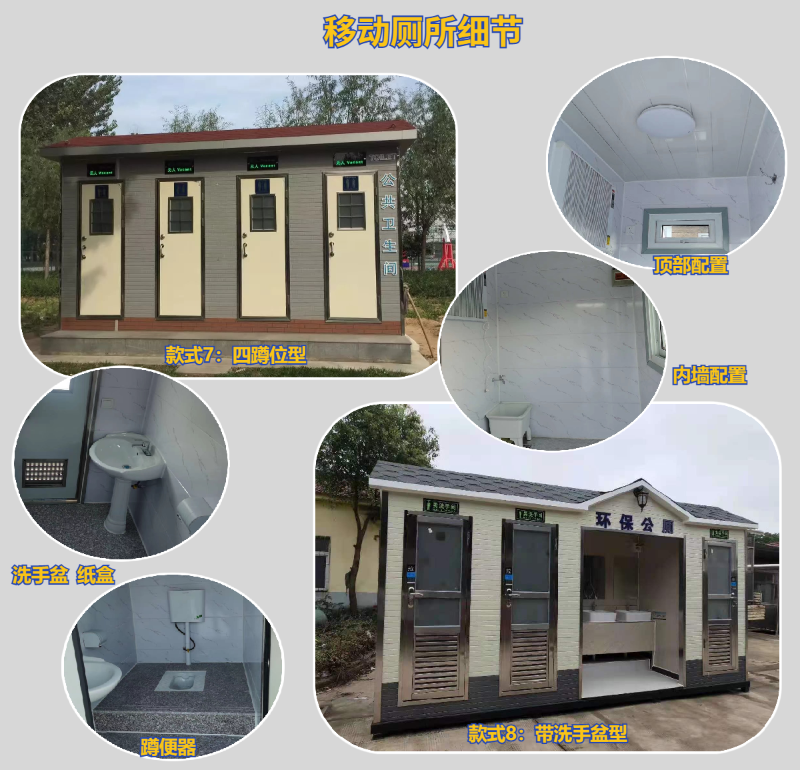 移動(dòng)公廁與傳統(tǒng)土建式廁所相比占地面積少,廁所還有抗震能力和防止疾病傳染功效,該款產(chǎn)品經(jīng)久耐用,高檔時(shí)尚、物美價(jià)廉,是一款公共場(chǎng)所不可缺少的設(shè)施。
