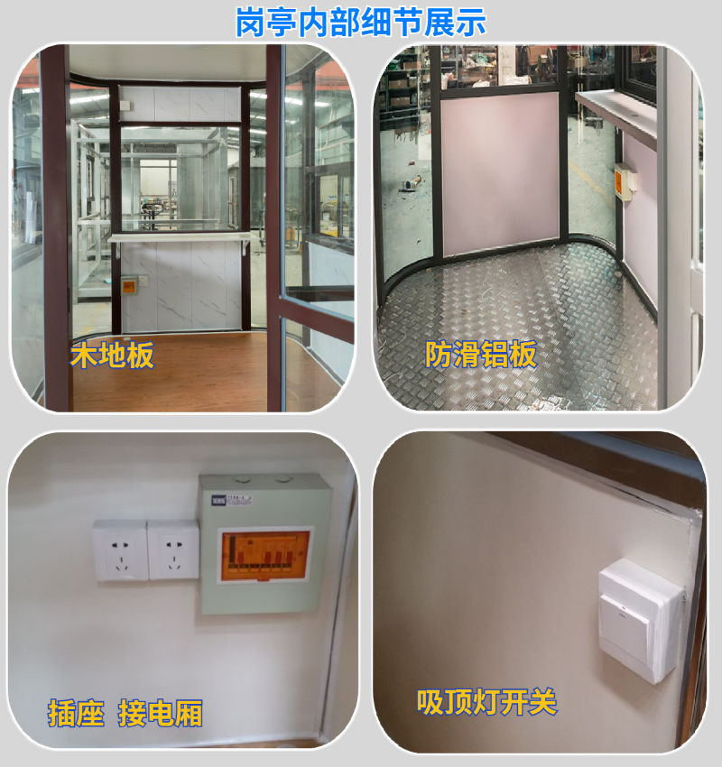 鋼結(jié)構(gòu)崗?fù)?/strong>內(nèi)部細(xì)節(jié):標(biāo)配版:PVC吊頂(選配鋁扣板)、吸頂燈、木地板(選配防滑鋁板),空調(diào)預(yù)留插座,內(nèi)部白色密度板(選配其它),燈開關(guān),接電廂,漏電保護(hù)器等。
