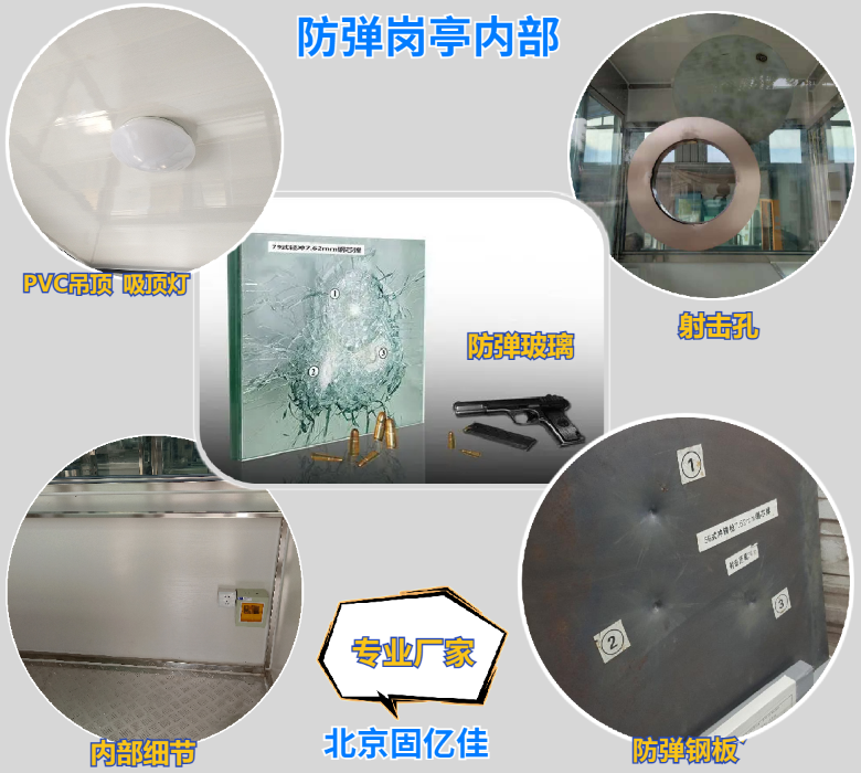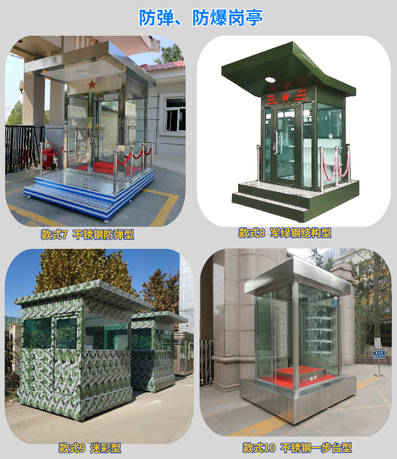 防彈崗?fù)S家所研制的防彈崗?fù)ぎa(chǎn)品,采用了防彈鋼板及防彈玻璃,有效保護(hù)崗?fù)?nèi)執(zhí)勤戰(zhàn)士的安全;崗?fù)ど显O(shè)有射擊孔,在滿足達(dá)到防彈功效的同時(shí),又方便戰(zhàn)士在崗?fù)?nèi)使用武器;頂部有活動(dòng)頂窗鋼板可以打開進(jìn)行通風(fēng)換氣。也可根據(jù)需求,調(diào)整門的位置及開門的方向和射擊孔的位置;